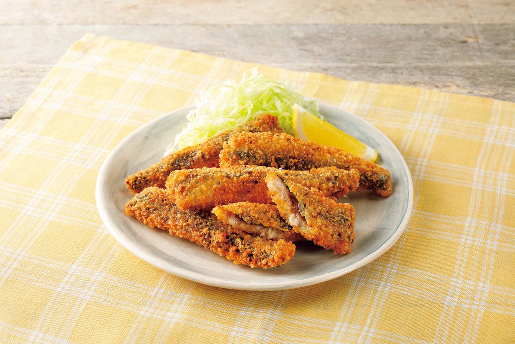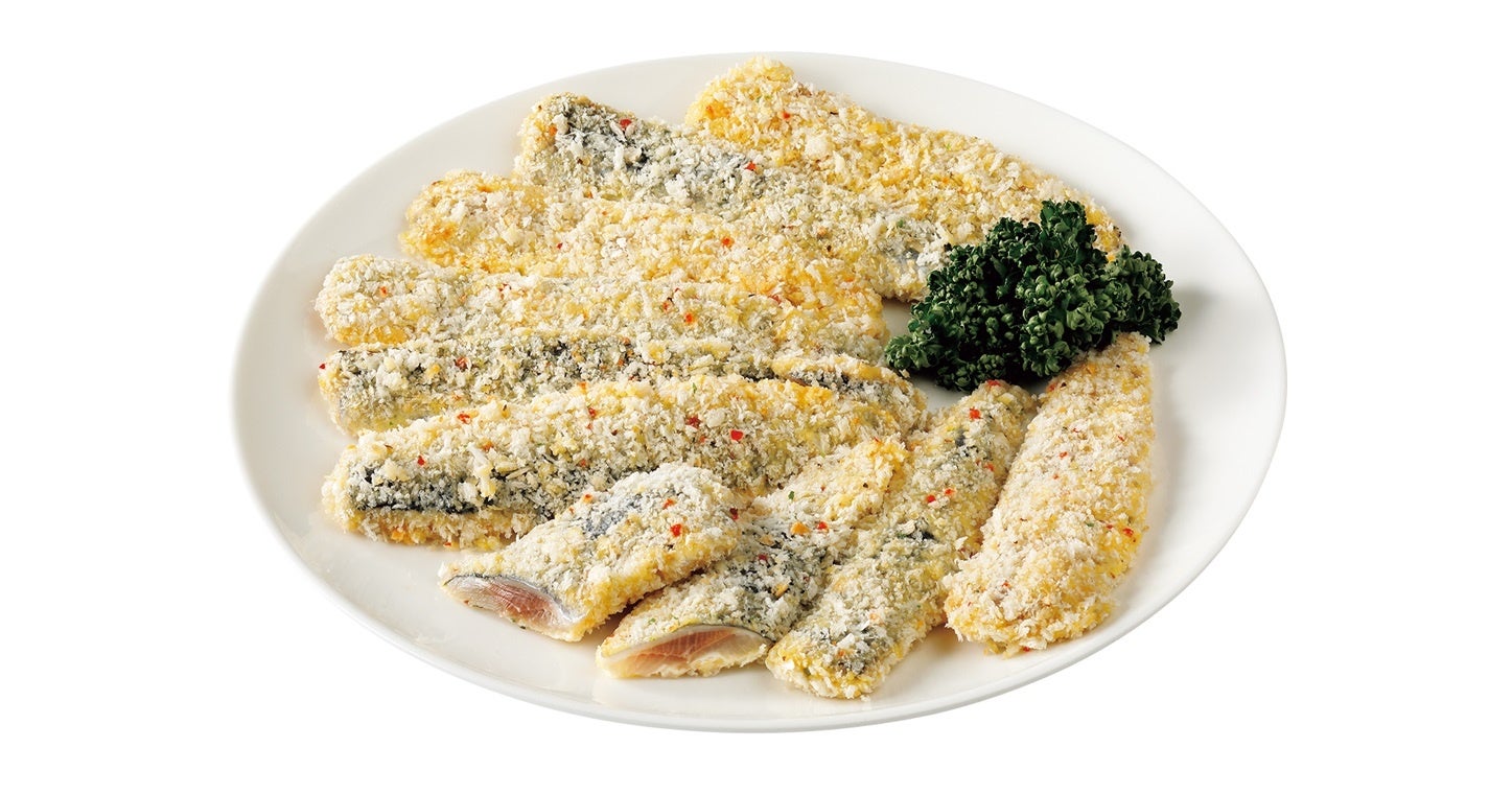 三陸沖で水揚げされ、当日中に急速冷凍した真イワシを3枚におろし、バッター液とパン粉に配合したスパイス&ガーリックソルトで洋風に味付け。フライパンでの揚げ焼きも可能で手軽に調理ができます。