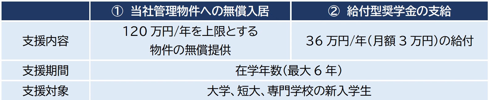 「当社管理物件への無償入居」・「給付型奨学金」の2種類からお選びいただけます。