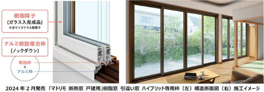 約半日で最新の窓に取替が可能なカバー工法を採用した“かんたん”窓リフォーム商品「マドリモ 断熱窓 戸建用」。その中でも高い断熱性能と防露性を兼ね備え、高い補助額が設定されている「先進的窓リノベ2024事業」の対象商品になる“樹脂窓 引違い窓 ハイブリット専用枠”を新発売します。樹脂障子にアルミ樹脂複合枠を組み合わせることで施工性が向上し、枠をスリム化したことで壁厚の薄い既存住宅への取り付けも可能にします。