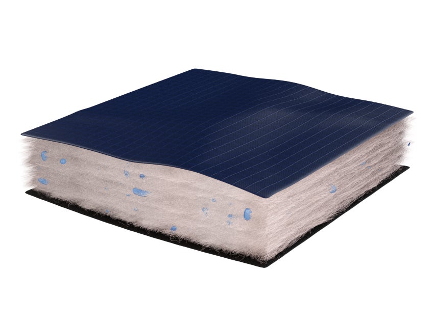 また、疎水加工した『ブレスサーモ』繊維と水を吸いにくいポリエステル繊維を混綿したことで、湿潤状態でも保温性の低下を抑制します。これにより、悪天候時などでも快適に過ごせるように設計されています。さらに、繰り返し洗濯をしても膨らみをキープします。水を吸いにくい特長から、乾きやすく、家庭でも手軽にお手入れが可能です。