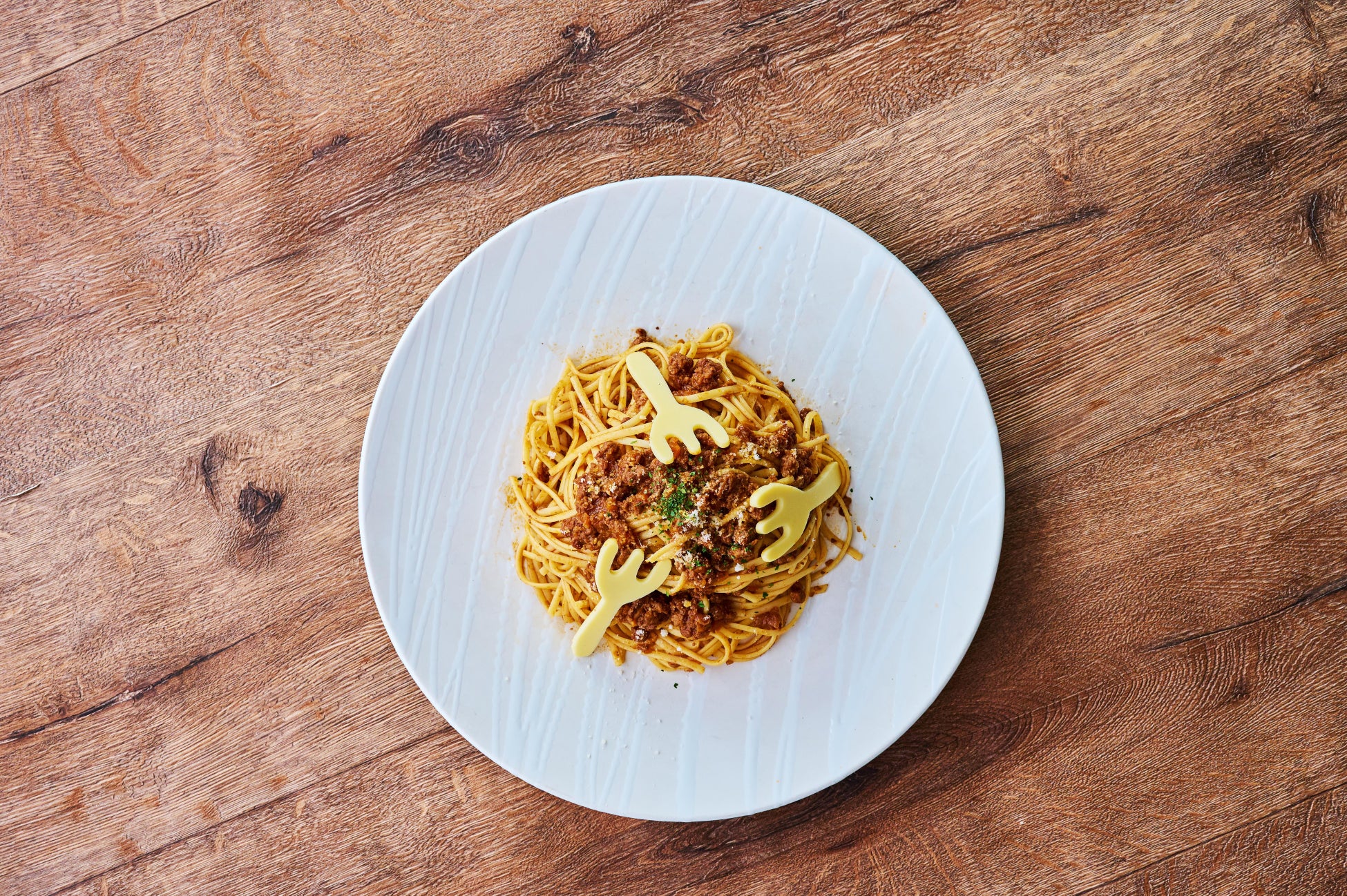 フォークをかたどったチーズを乗せ、和牛を使った贅沢なボロネーゼスパゲティです。