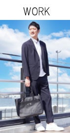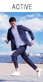 今回発売する『アクティブワークスーツ®(紺/黒)』は、凹凸感が特長のサッカー素材を使用し、ストレッ性・通気性に優れており、アクティブなシーンにも最適です。シリーズ初となるメッシュ裏地にすることで、肌の張り付き感も軽減され、快適な着心地を実現しました。ジャケットの下前内ポケットには、ファスナーを取り付け、ジャケットの着脱機会が多い夏のビジネスシーンでも、ポケットの中身が落ちることなく安心です。パンツの型紙も改良し、股上を1cm浅くすることで、すっきり感がアップしました。インナーにビズポロを合わせることで、ビズスタイルはもちろん、Tシャツとコーディネートすることでレジャー、旅行をはじめとしたカジュアルシーンにも使いやすいデザインです。