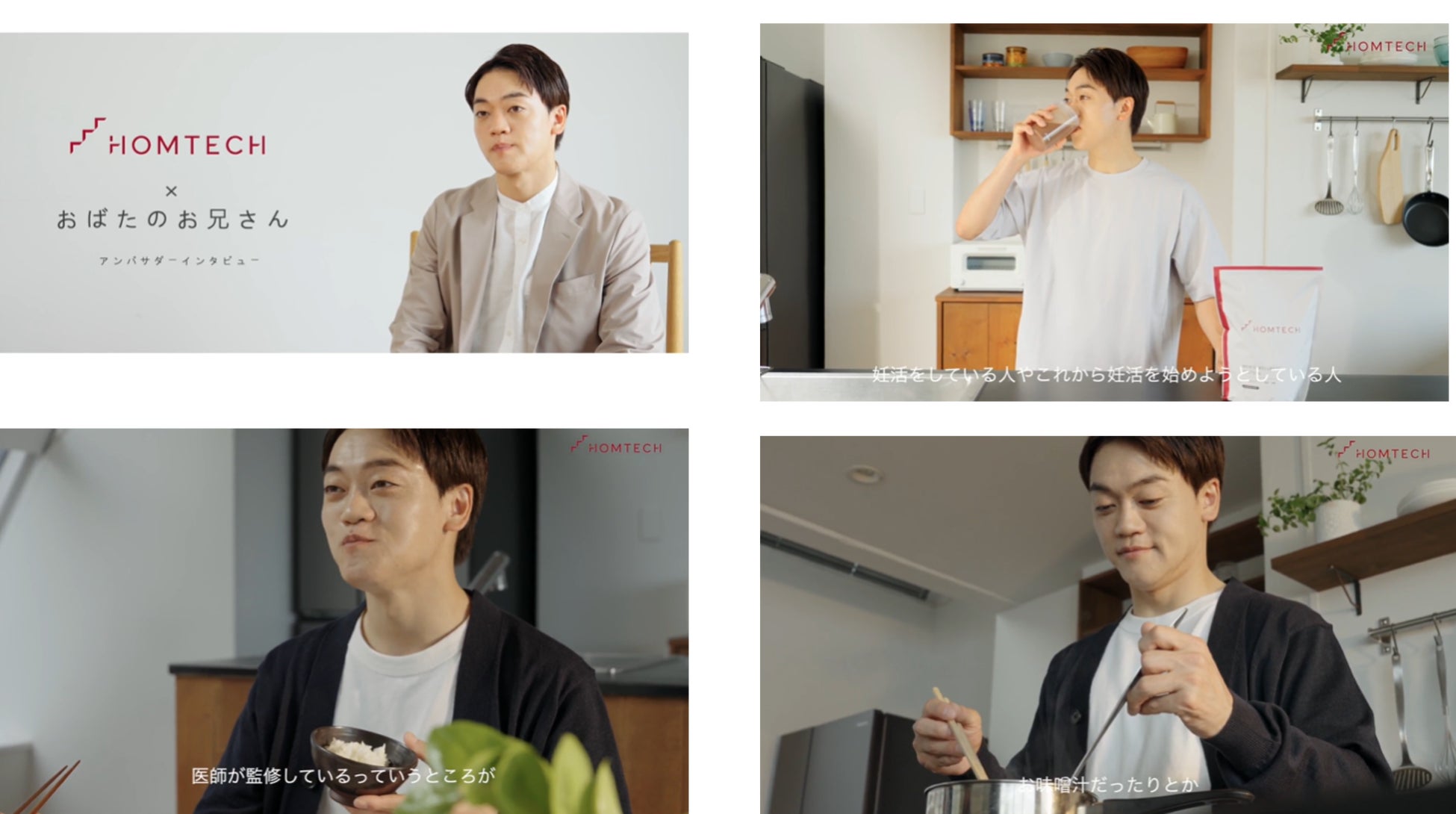 今回のWEBCMでは、実際に妊活を経験されたおばたのお兄さんに、ご自身の妊活体験を振り返っていただきながら、当時感じていた不安や戸惑い、そして得られた学びについてお話しいただき、男性側の健康管理や、意識改革の必要性について語っていただきました。また、実際に「HOMTECH[オムテック]」のプロテインやはぐくむシリーズをお試しいただいた感想もいただいております。