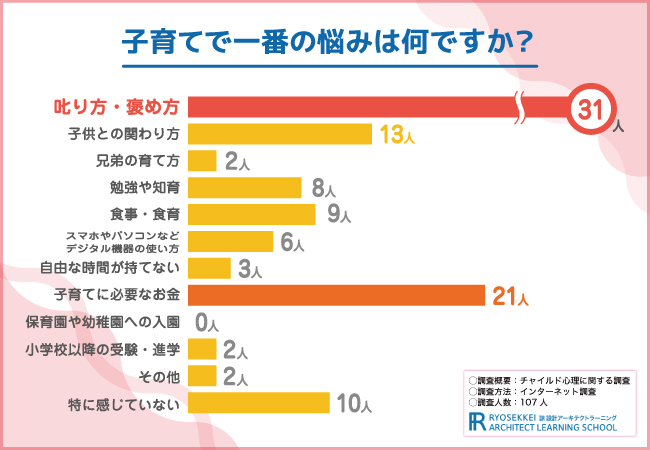 子育ての悩みとして、「叱り方や褒め方」が最も多い結果に