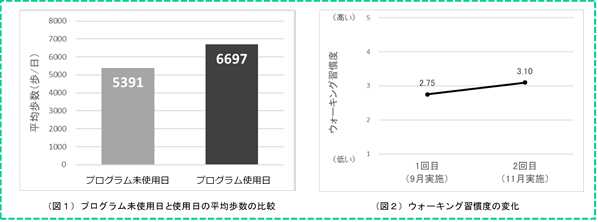 本研究において、イオンモールアプリのウォーキングプログラム(※1)の利用者から取得した歩数データやアンケート調査データを分析したところ、イオンモールへの来店やウォーキングプログラムの利用が、利用者の歩数や、ウォーキング習慣度(※2)の向上と関連していました。