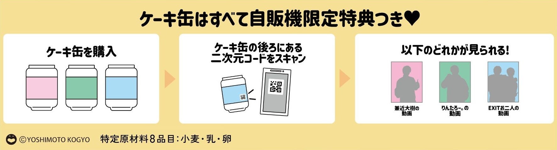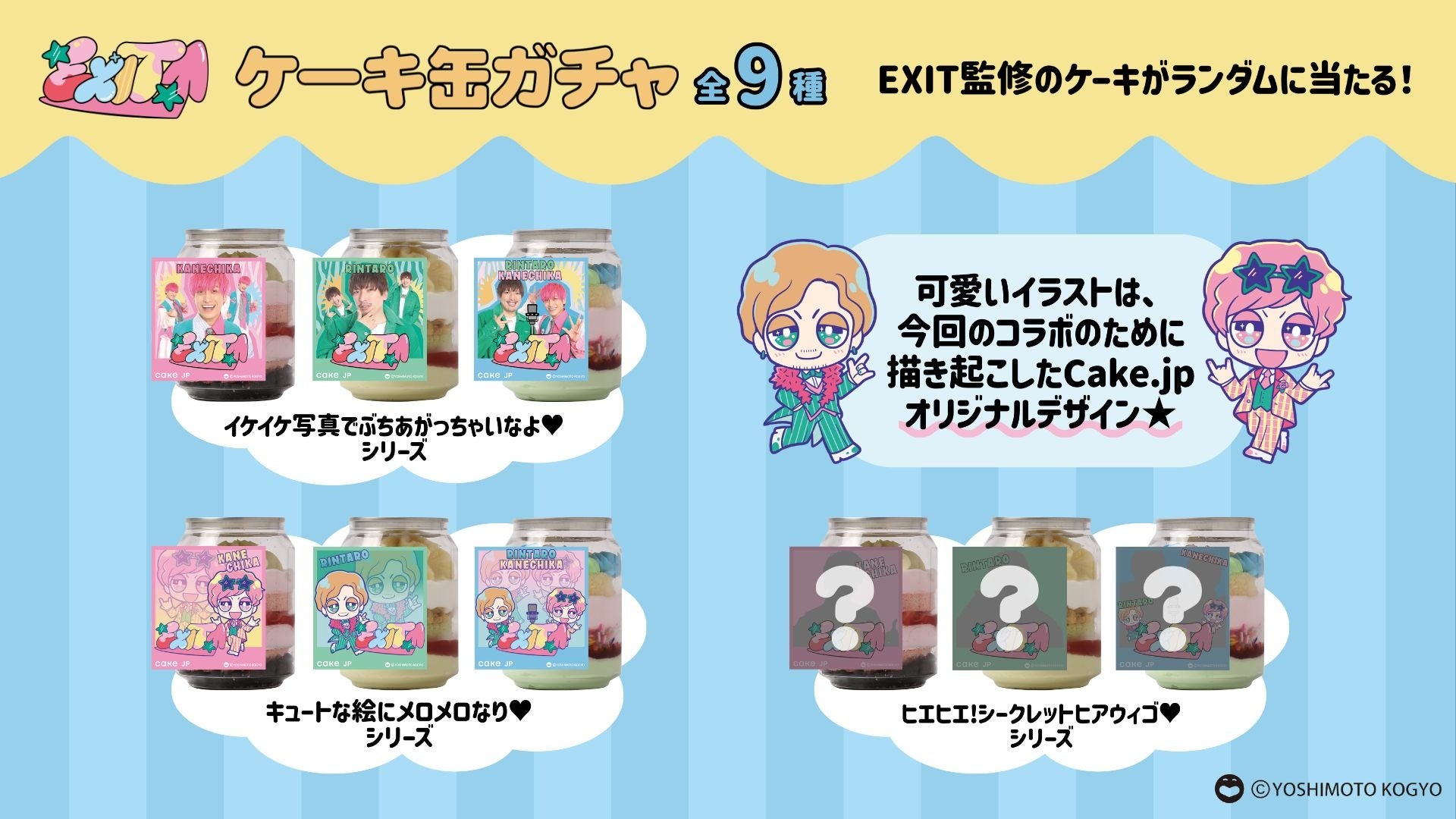 EXITのお二人が考案したケーキ缶をランダムにご購入いただけます。コラボケーキ缶のお味は全3種、自販機オリジナルのラベルシールはシークレット含む全9種!