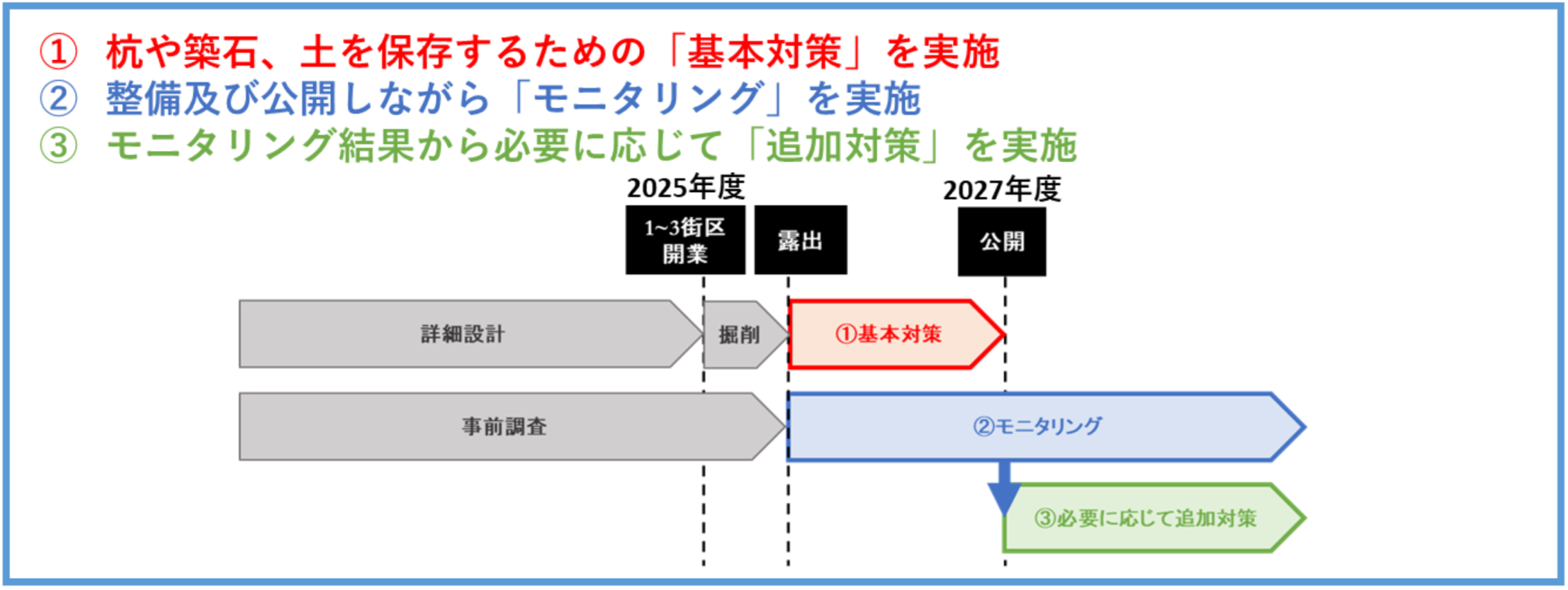 高輪築堤を構成する杭や築石の腐朽・塩類析出対策等の保存科学や高輪築堤の構造安定性などについて、有識者のご指導のもと技術的な検討を行い、適切な保存対策および継続的な維持管理を行うことで、高輪築堤跡の現地公開が可能となりました。今後、現地公開に向けて、具体的な検討を進めていきます。(参考1参照)