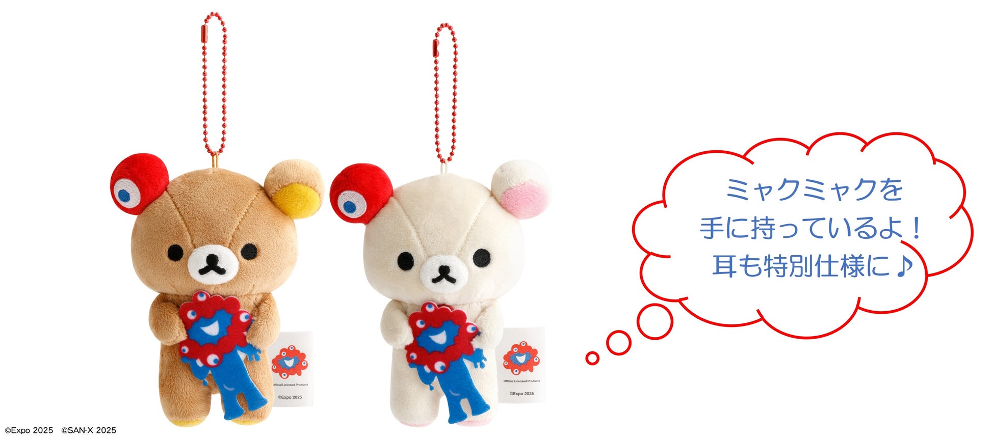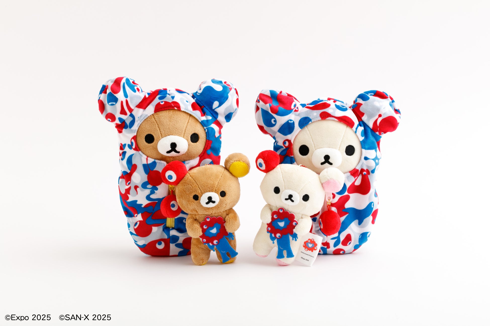 大阪・関西万博公式キャラクターである「ミャクミャク」を手に持っている、リラックマ・コリラックマのぶらさげぬいぐるみや、「ミャクミャク」のような柄の寝袋に包まれ、寝袋を脱ぐとリラックマ・コリラックマの耳やおなかが「ミャクミャク」柄になっているぬいぐるみなど、大阪・関西万博とのコラボならではの特別なデザインのアイテムになっています。