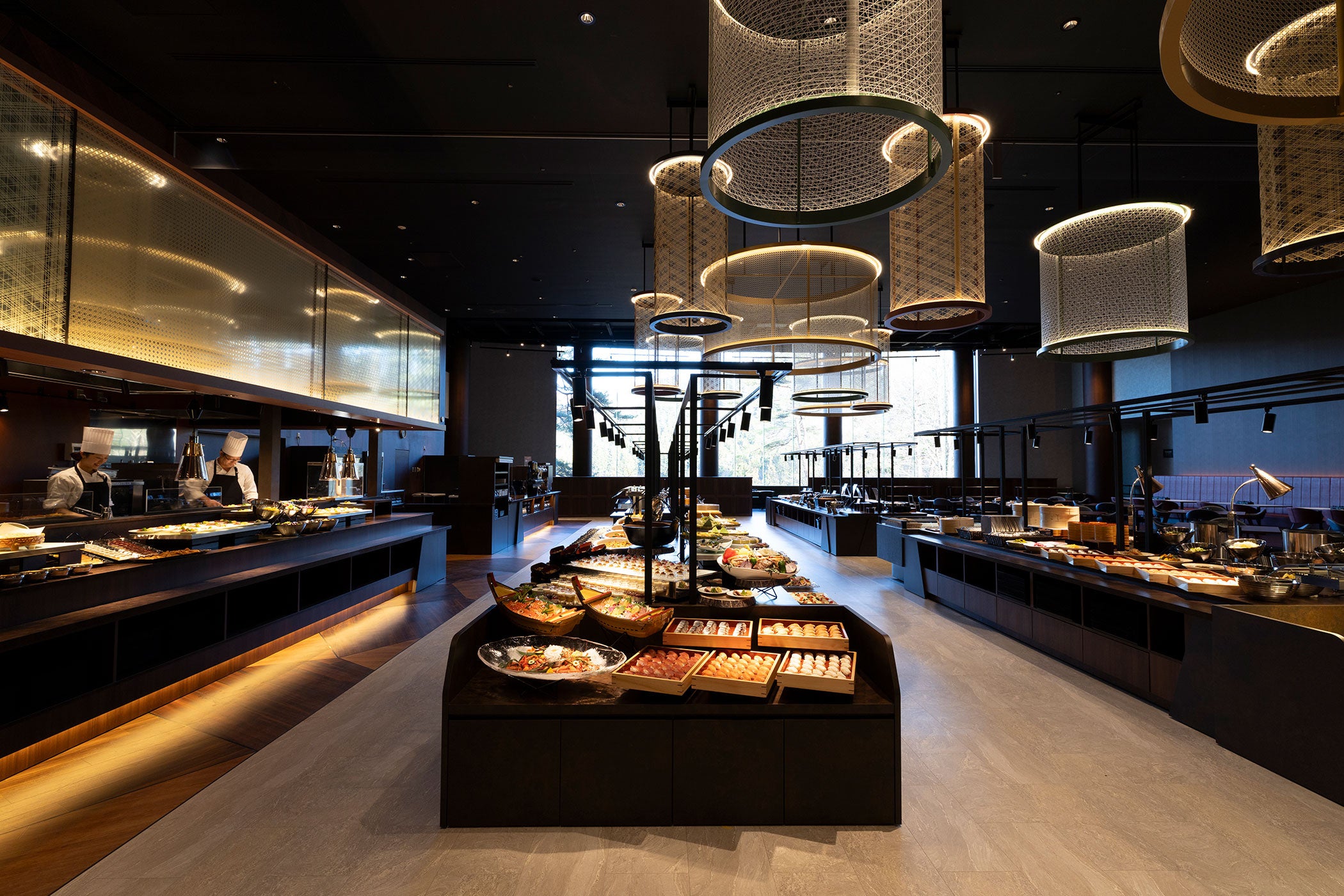 大きな二面の窓からは、雄大な松の木と四季折々の美しい景色が楽しめ、レストランの内部は、外の景色をそのまま取り込むような落ち着いたトーンで統一しています。一本桜や菜の花、紅葉といった岩手を象徴する花々の色彩を家具で表現し、華やかさを添えました。中央のバーカウンターには、花巻まつりの太鼓をモチーフにした象徴的な照明を設え、この土地ならではの文化を感じさせる空間です。