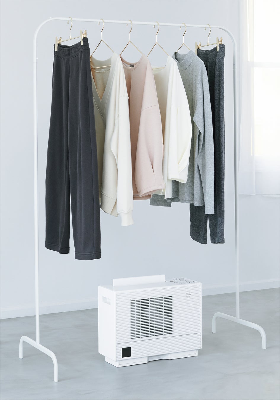 高さを抑えたコンパクトなボディで、洗濯物の真下に設置して衣類乾燥ができます。さらに、未使用時にはコードをしまえるので、すっきり収納できます。