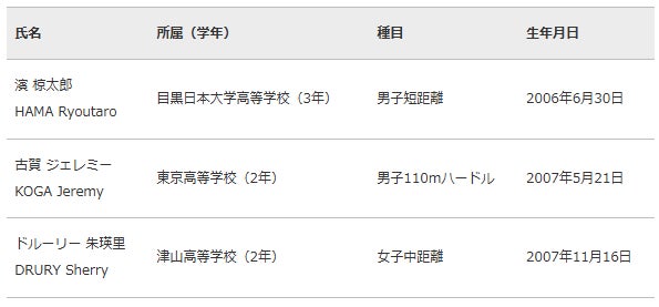 また、第11期より新設された「ダイヤモンドアスリートNextage」には濱椋太郎(目黒日本大学高等学校3年・東京)、古賀ジェレミー(東京高等学校2年・東京)、ドルーリー朱瑛里(津山高等学校2年・岡山)の3名が選出されました。ダイヤモンドアスリートNextageは実際のダイヤモンドアスリートプログラムの一部を経験し、ダイヤモンドアスリートになるための準備をすすめます。