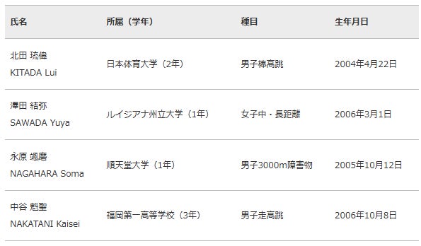 継続認定となるのは第9期認定の北田琉偉(日本体育大学2年・棒高跳)、澤田結弥(ルイジアナ州立大学1年・中長距離)、第10期認定の永原颯磨(順天堂大学1年・3000m障害物)の3名です。