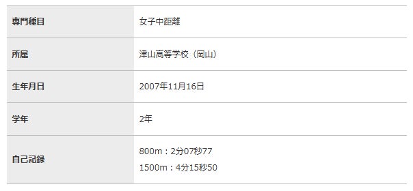 今季は4月末にドバイ(UEA)で開催されたU20アジア選手権1500mで金メダルを獲得。U20の部でなく、日本選手権1500mに挑戦して7位入賞を果たした。インターハイは、800mが準決勝、1500mは決勝11位にとどまったが、8月末にはリマ(ペルー)で開催されたU20世界選手権にも出場(1500m)するなど、経験の場を広げている。