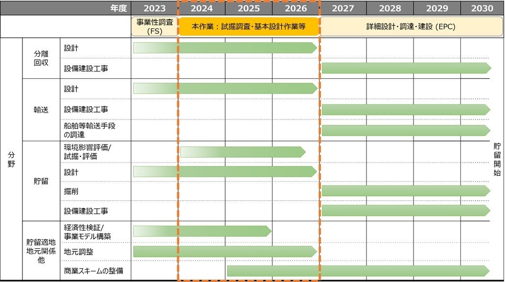 今回採択された本作業では、その次のフェーズとなるCO2の分離回収・輸送・貯留に係る基本設計(FEED:Front End Engineering Design)作業、試掘調査等を行います※4。上述の事業性調査の結果を基に、CO2の分離回収・船舶輸送・地下貯留の各要素に対して技術面・経済性の両面から事業の基本設計作業等を進め、2030年度の操業開始に繋げていくことを目標としています。