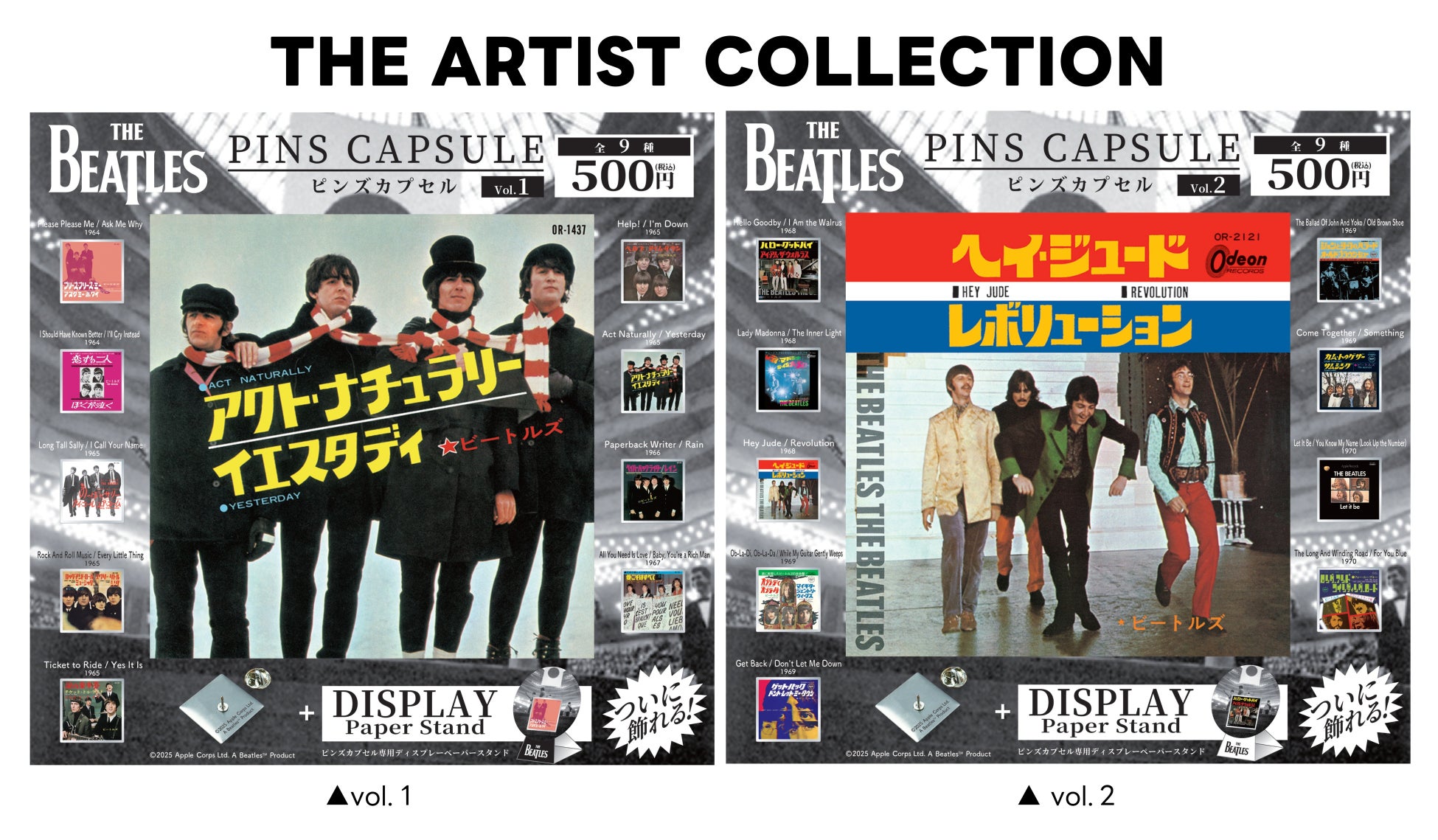 同じく本日発売となるザ・ビートルズ『アンソロジー』を記念した企画となり、日本で発売されたシングル(7incシングル/ドーナッツ盤)ジャケットをセレクト、「THE BEATLES」の歴史を網羅した"「THE BEATLES」日本盤シングル・ジャケット・コレクション"です。さらに、今回、装いを新たにピンバッジを専用台紙に付属したままディスプレイできる「専用ディスプレイ・ペーパースタンド」付きの仕様となります。