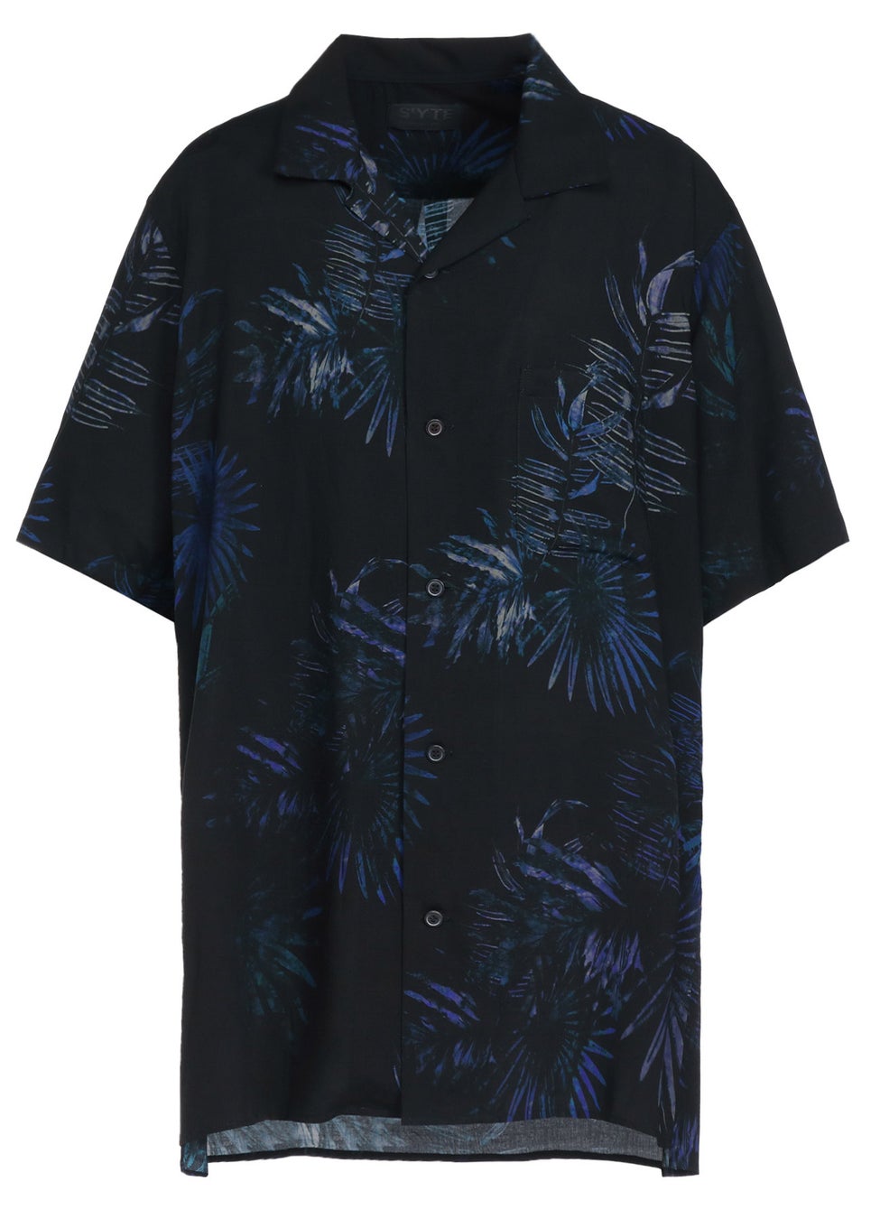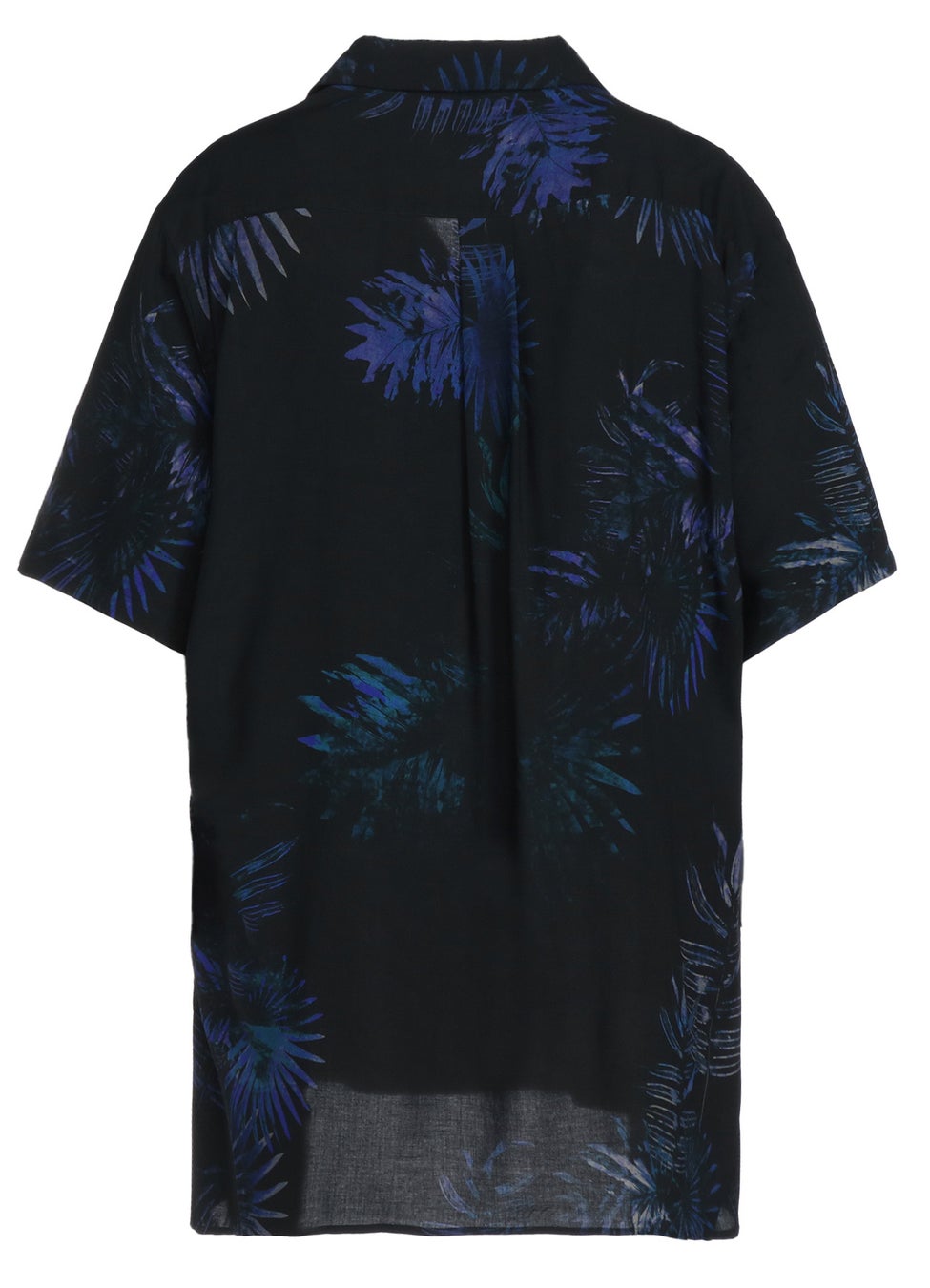 ブラックのボディにブルーグラデーションを基調としたヤシの葉を総柄プリントすることで、落ち着きのあるダークトーンに纏まったレーヨン素材の開襟シャツ。しなやかで肌馴染みの良い質感と軽やかなドレープ性を持つ極薄手のレーヨン生地は、涼やかな印象を与える1着となっています。