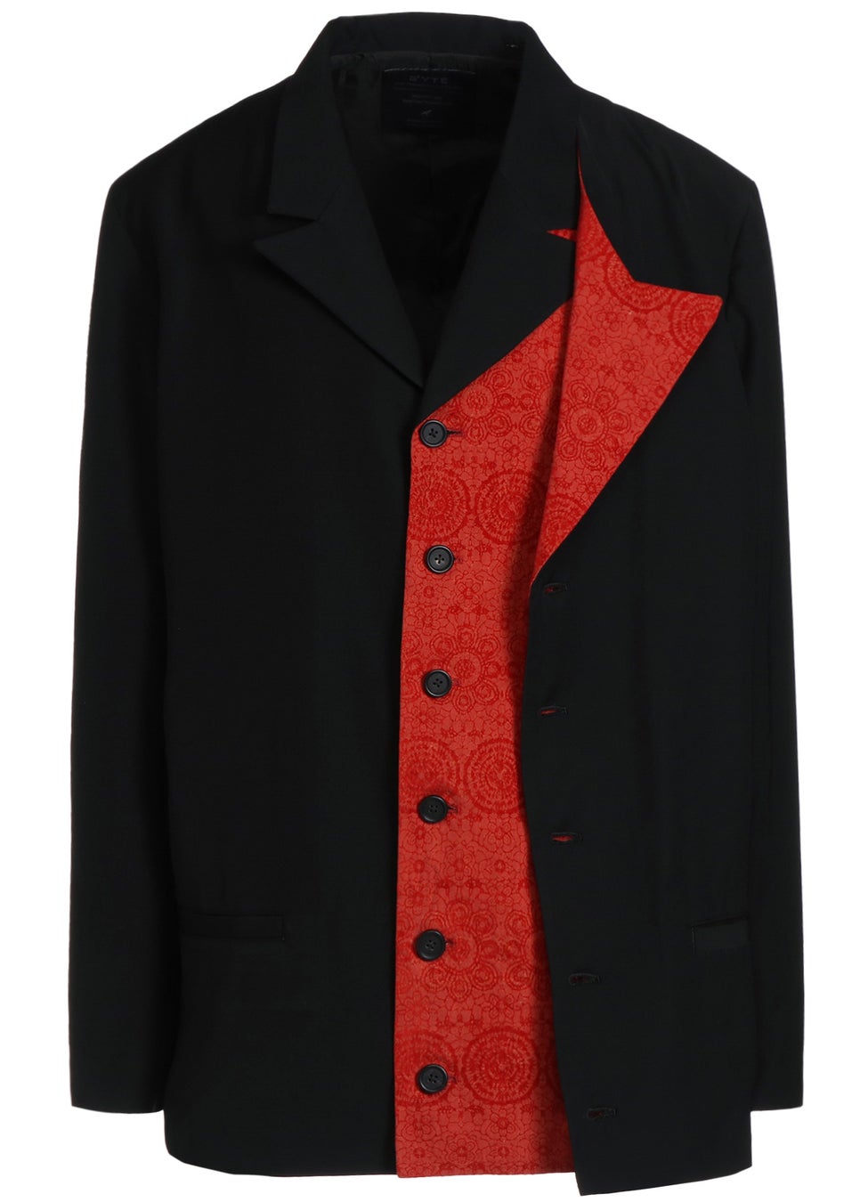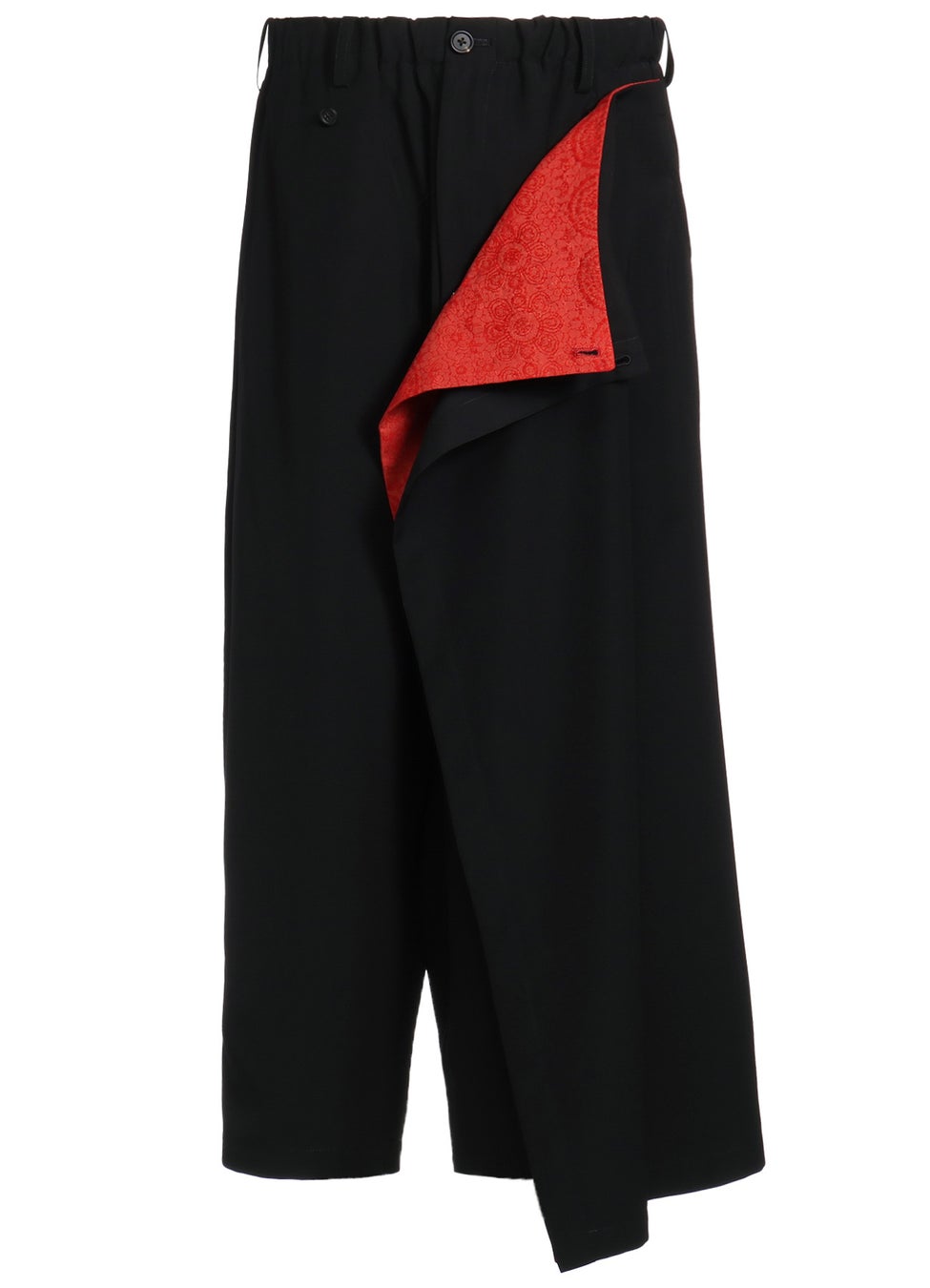 クラシカルなテーラードジャケットをベースに、二重仕立てのディティールから覗く独特なフェード感が魅力の赤レース柄を切り替え部分に使用した、オリエンタルな雰囲気が漂うレイヤードデザインとなっています。裾口に向かって細くなるテーパードのワイドパンツに、分量のある生地をラップ状に組み合わせたラップパンツにもラップ部分に赤レース柄を使用しました。