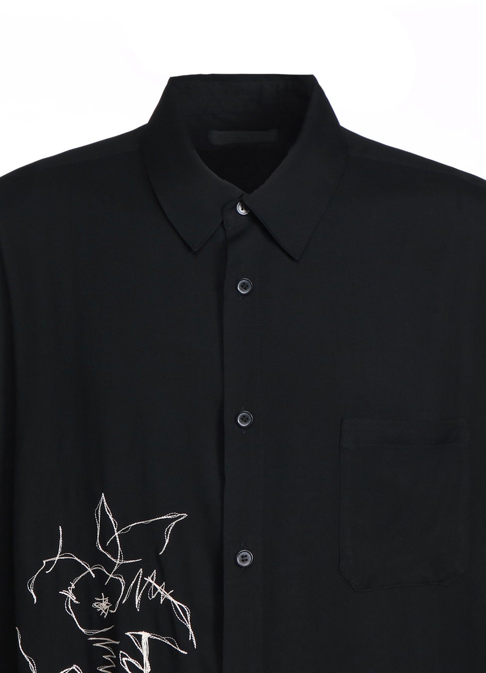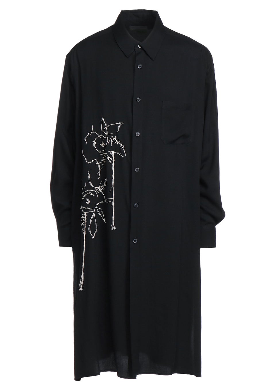 「儚い美」や「艶やかな美人」の花言葉を持つサボテンの花を前身頃に刺繍したレーヨン素材のロングシャツ。手描きのデッサンを振りミシンで刺し上げた刺繍は、一本一本の輪郭線に拘ったアイテム。