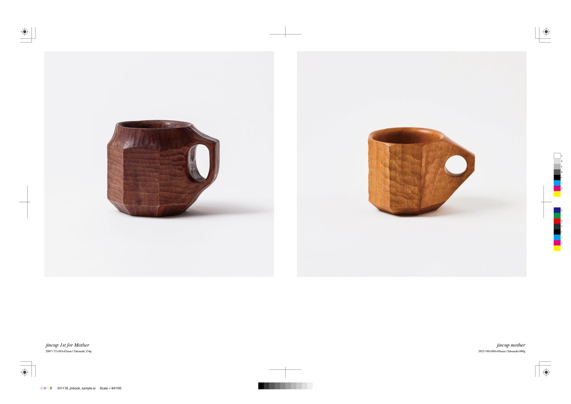 今回の展示は、書籍と、前述の「jincup1st」を17年経った今の形としてリデザインして制作された「jincup MOTHER」、そして「BOOK SUIT」と名づけられた木のブックカバーのお披露目となります。 また、出版記念として、jincupのこれまでの歴史を貴重なアーカイブとともに体験することができるjincupの歴史展を開催いたします。
