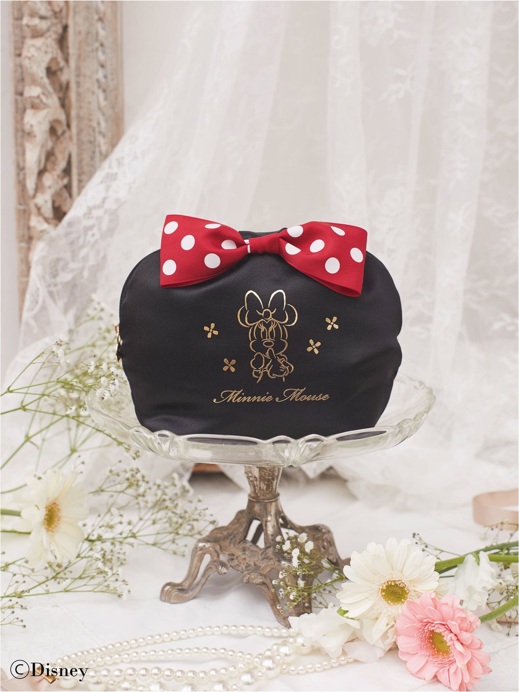 一方で、シックな黒で統一したサイドポケットトートバッグとポーチ、カードケースには、赤いドットリボンをプラス。それぞれに表情やポーズの違うミニーマウスとお花をプリントしました。