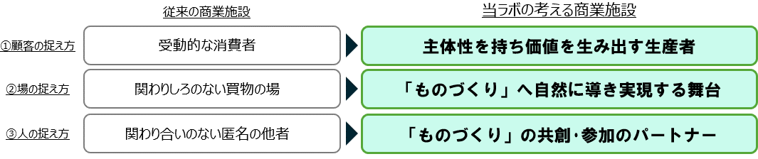 ラボメンバーのワークショップを通して「ものづくりによるウェルビーイング」を実現するポイントを導出。商業施設の顧客・場・人の捉え方を転換していく考えです。
