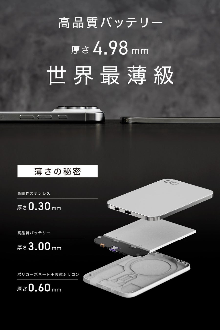 厚さ4.98mm・重さ約82gのミニマル設計。 iPhoneの背面に装着しても出っ張らない、かさばらない。持ち歩いていることを忘れるほどの世界最薄クラスのモバイルバッテリーです。