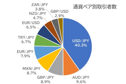通貨ペア別取引者数のトップ10は、USD/JPY(米ドル/円)・AUD/JPY(豪ドル/円)・GBP/JPY(ポンド/円)・MXN/JPY(メキシコペソ/円)・EUR/JPY(ユーロ/円)・TRY/JPY(トルコリラ/円)・EUR/USD(ユーロ/米ドル)・NZD/JPY(NZドル/円)・ZAR/JPY (南アフリカランド/円)・GBP/USD(ポンド/米ドル)の順。