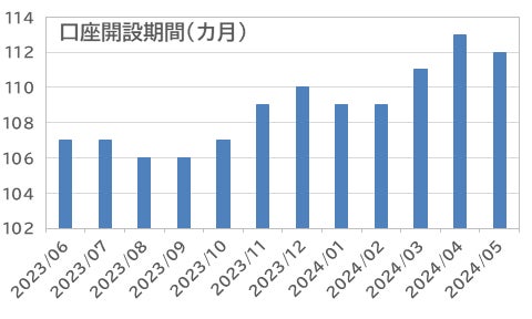 取引をしたFX投資家の口座開設後の期間は、平均112カ月(9年4カ月)と、前月から縮小した。もっとも、直近、1年での最長付近に留まっている。
