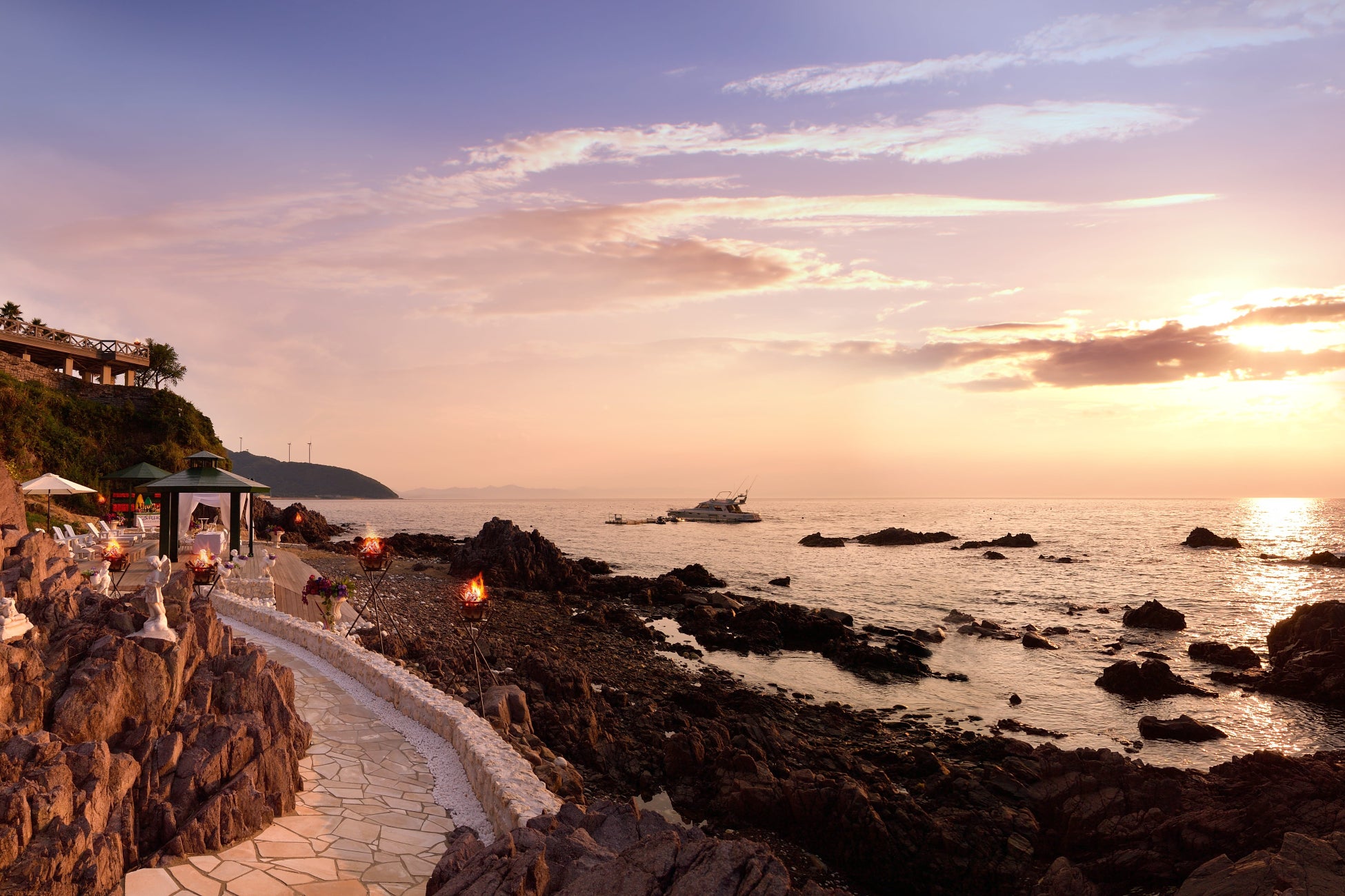 全棟オーシャンビューの贅沢なロケーションに、追加料金なしで楽しめるオールインクルーシブサービスを備えた「絶景・癒し・グルメ」が揃う関西屈指の大型グランピングリゾート。