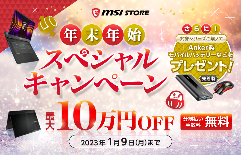 最新モデルを含む対象ノートPCが最大10万円OFF! 対象ノートPCのご購入でAnker製モバイルバッテリーなどもプレゼント! 『MSIストア年末年始スペシャルキャンペーン』