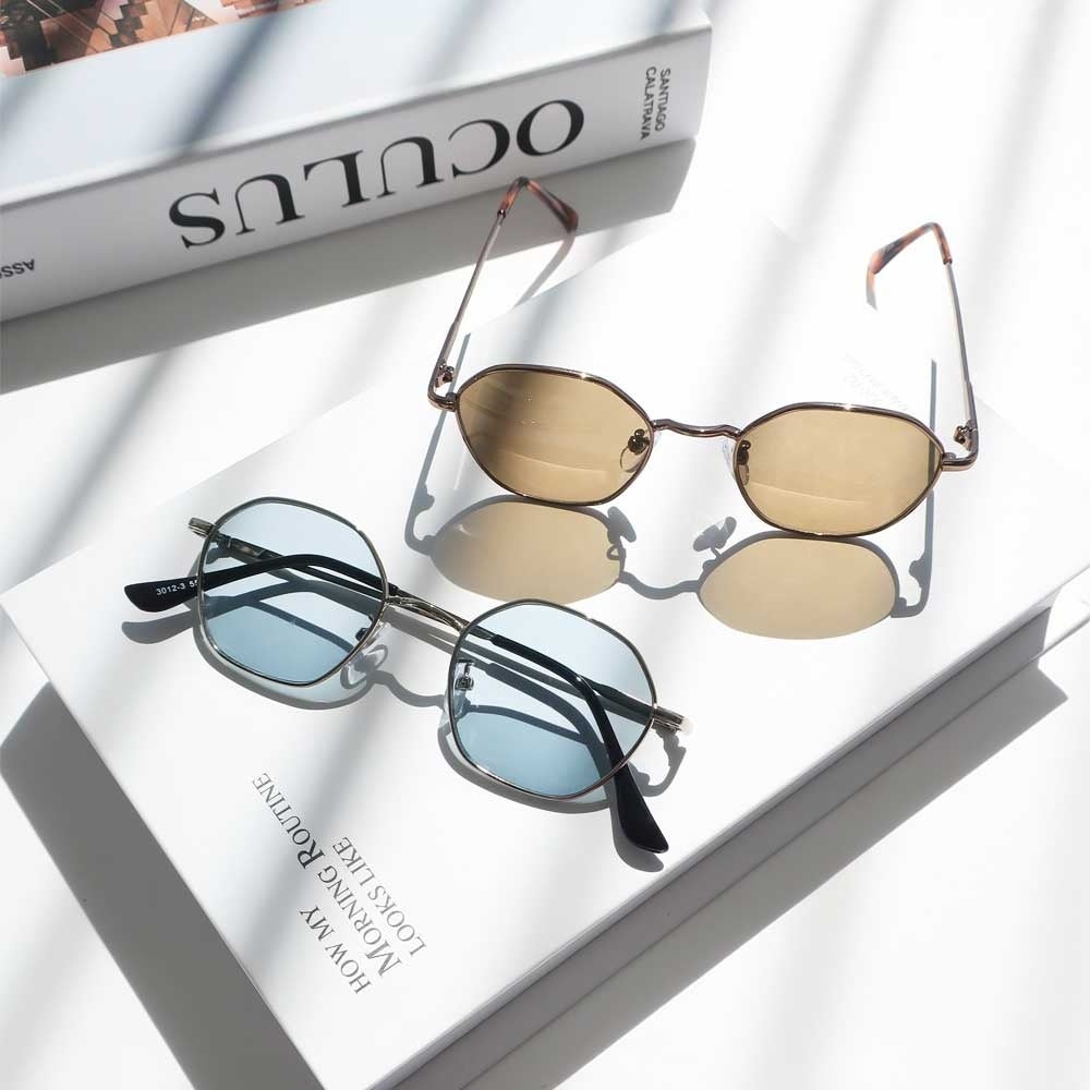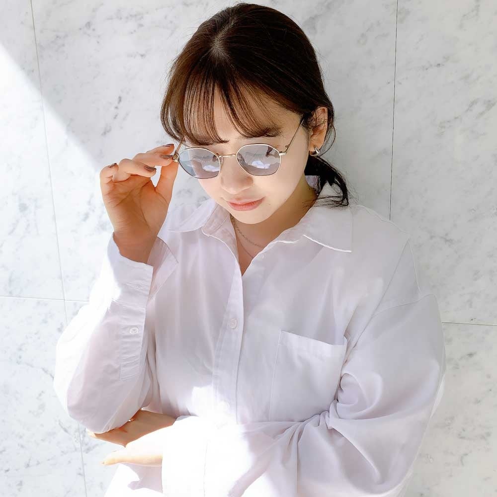 細フレームでブルーのレンズは少し遊び心があり、海などのお出かけにもおすすめです。