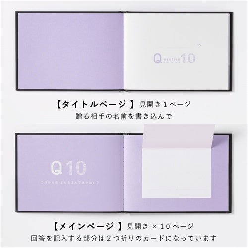 2人の愛にまつわる10の質問の答えを、10枚のラブレター形式で贈るプレゼントブック。質問に答えを書き込むだけで、想いの伝わる特別な一冊が完成します。