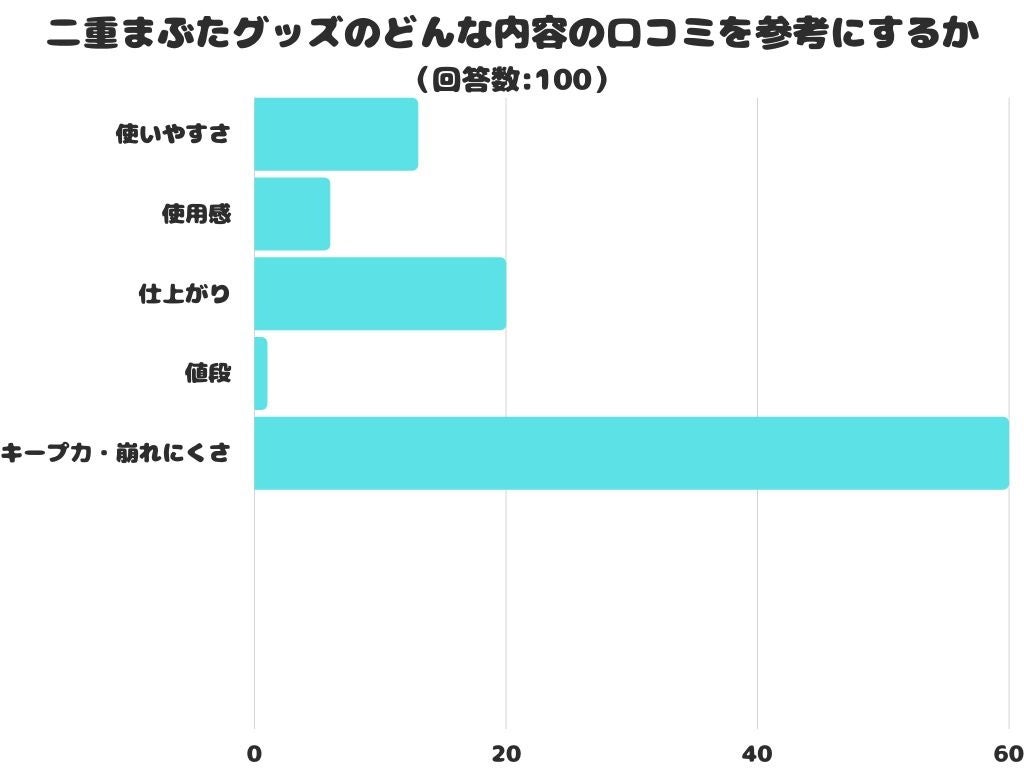 二重まぶたグッズのどんな内容の口コミを参考にするかをアンケートにて調査したところ、1位は「キープ力・崩れにくさ」でした。