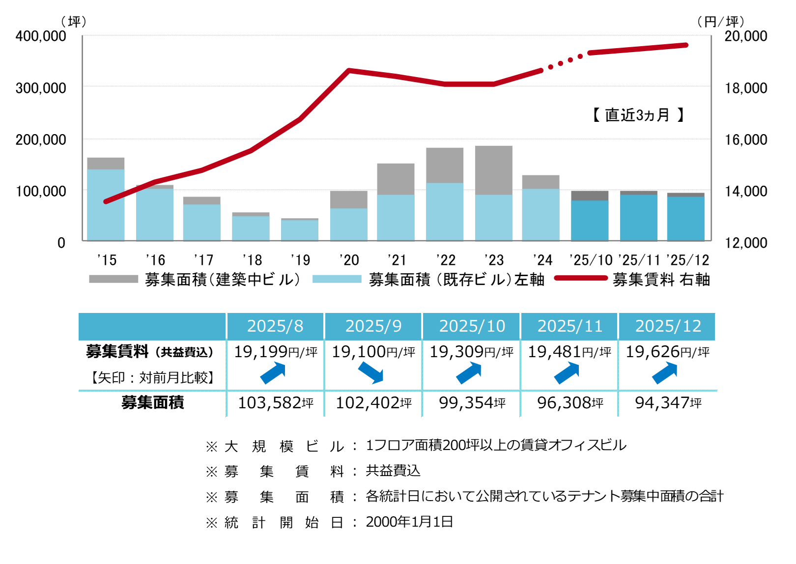 募集賃料は前月比プラス145円/坪の19,626円/坪と、3ヵ月連続で上昇した。賃料は緩やかな上昇傾向が続いている。