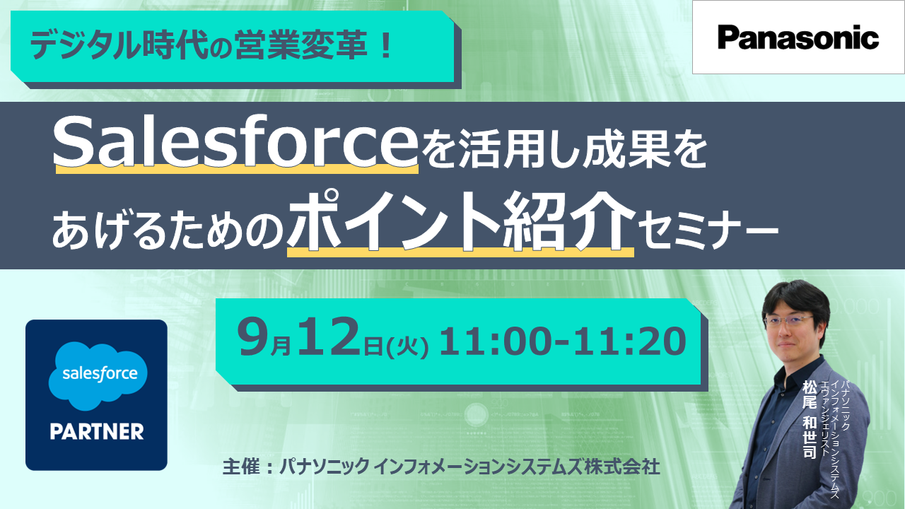 パナソニック インフォメーションシステムズ株式会社は2023年9月12日(火)、『デジタル時代の営業変革!Salesforceを活用し成果をあげるためのポイント紹介セミナー』を開催します。