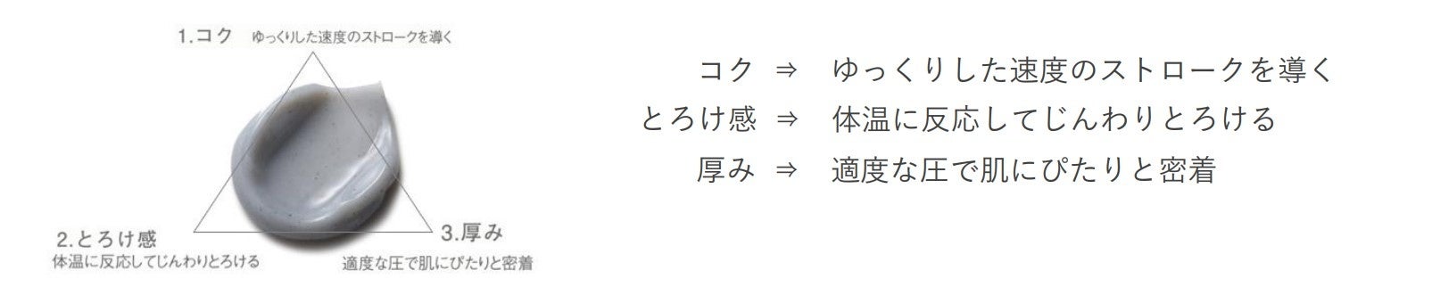着目したのは、大切なものを撫でるときの“秒速 5cm”の動き。人が本能的にここちよさを感じることがわかっています。そんな肌と心にここちよい動きを自然と導くテクスチャーに秘められた3つのこだわり。