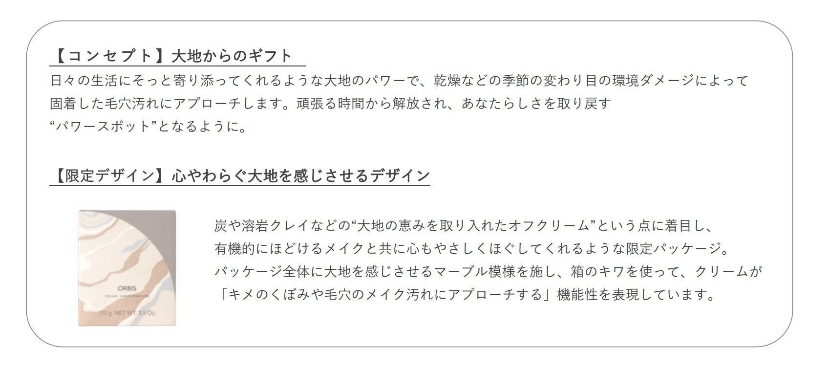 この度、昨年季節限定で発売し大好評を頂いた『オルビス オフクリーム 大地からのギフト』が、炭※2やクレイなどの素材の恵みを取り入れた大地を感じさせるデザインに刷新し、今年も再登場。『オルビス オフクリーム』は、肌と同時に心までも「オフモード」に切り替えるクレンジングとして、 2020 年の発売からベストコスメ 47 冠※3を受賞、愛用者 51 万人※4、販売個数 200万個※5を突破した人気クレンジングです。『オルビス オフクリーム 大地からのギフト』では、季節の変わり目などの乾燥によって毛穴の汚れ※6が固くつまりやすくなるという毛穴悩みに着目。そこで、「毛穴汚れをほぐす・肌をほぐす・心をほぐす※7」3 つのアプローチを採用し、肌と心をほぐすここちよいテクスチャーと吸着成分で毛穴汚れを一掃する限定品として、外箱デザインを新たに再登場いたします。