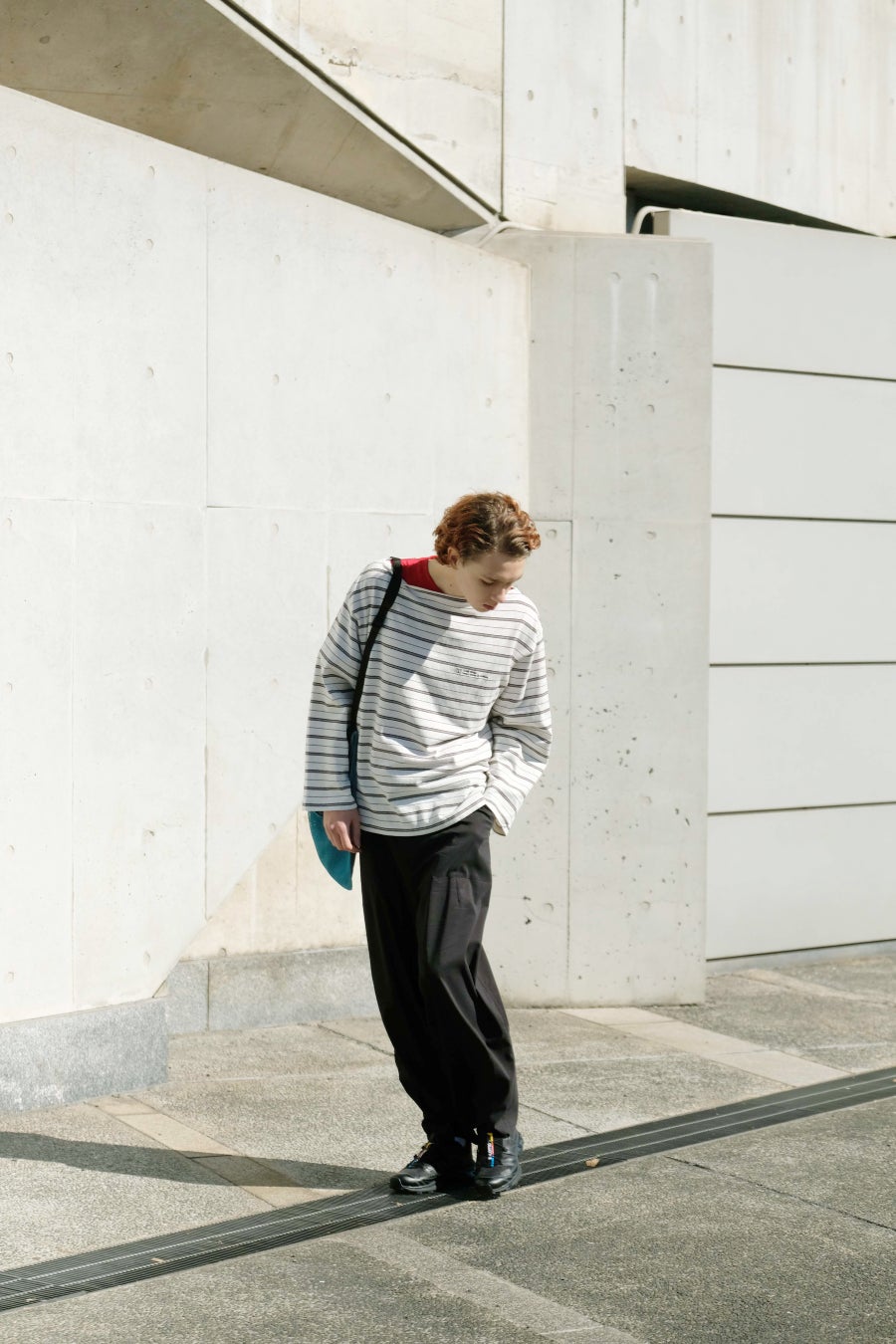ショート丈で広めのボートネックプルオーバーに、ポロシャツタイプを重ね着したレイヤードスタイルでこなれ感を出したスタイルに。大人な2配色のボーダーでカジュアル過ぎずに着こなせます。