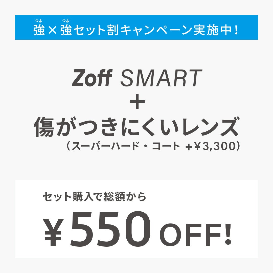 「Zoff SMART」シリーズ 800万本(2023年8月末時点)達成の感謝の気持ちを込めて、2023年10月2日(月)から11月16日(木)の期間、しなやかで壊れにくい「Zoff SMART」を購入の際に、通常のレンズの約3倍キズがつきにくくなるコーティングとして人気の「傷がつきにくいレンズ(スーパーハード・コート)」をセットでお選びの場合、購入金額から550円値引きとなる「強×強(つよつよ)セット割キャンペーン」を実施します。