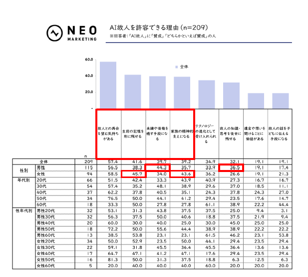 女性は「家族の支え」「記憶の保存」として、男性は「未練の癒し」「知のアーカイブ」としてなら許容傾向。