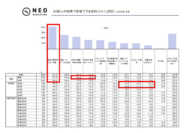 AI故人の利用について、どのような目的なら許容できるかをお聞きしました。