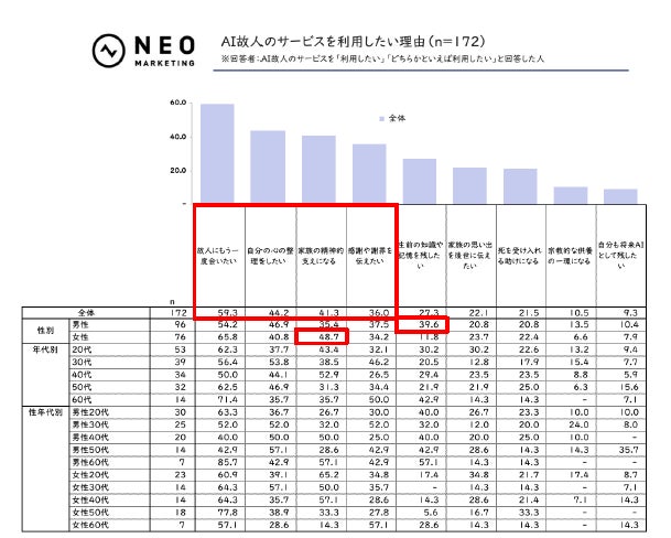 男女別では、男性に「生前の知識や記憶を残したい」(39.6%)、女性に「家族の精神的支えになる」(48.7%)が相対的に強く表れています。