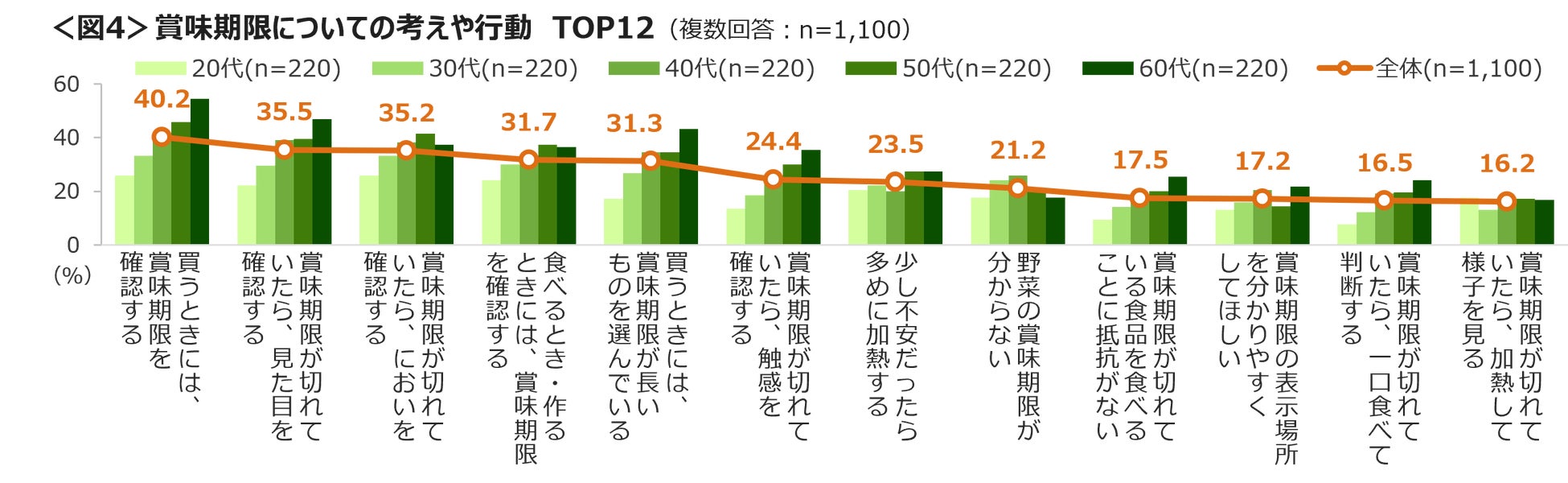 年代が高いほど、賞味期限を意識・確認しているが、60代では賞味期限が切れていても「食べることに抵抗がない」「一口食べて判断する」が他年代と比べ高め。<図4>