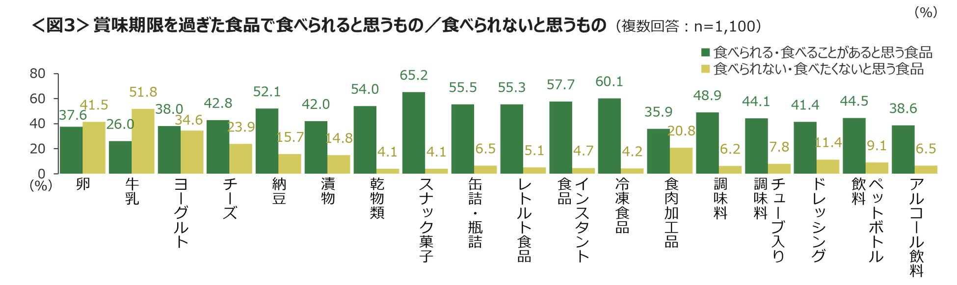 「卵」「ヨーグルト」は、賞味期限を過ぎても食べられると思う人、食べられないと思う人に意見が分かれる。<図3>