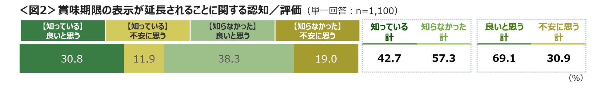 賞味期限の表示が延長されることについて、「知らなかった」は57.3%。表示延長の認知に関わらず、「良いと思う」人は7割。<図2>