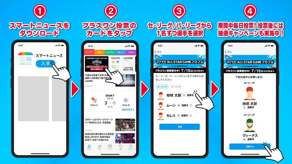 スマートニュースでは、この取り組みをさらに広げ、7月23日・24日に開催されるマイナビオールスターゲーム2024をファンの方と共に盛り上げていくために、スマートフォンアプリとして初めて、SmartNewsでファン投票の受付を実施することを決定しました。昨年に引き続きプラスワン投票の受付も実施します。