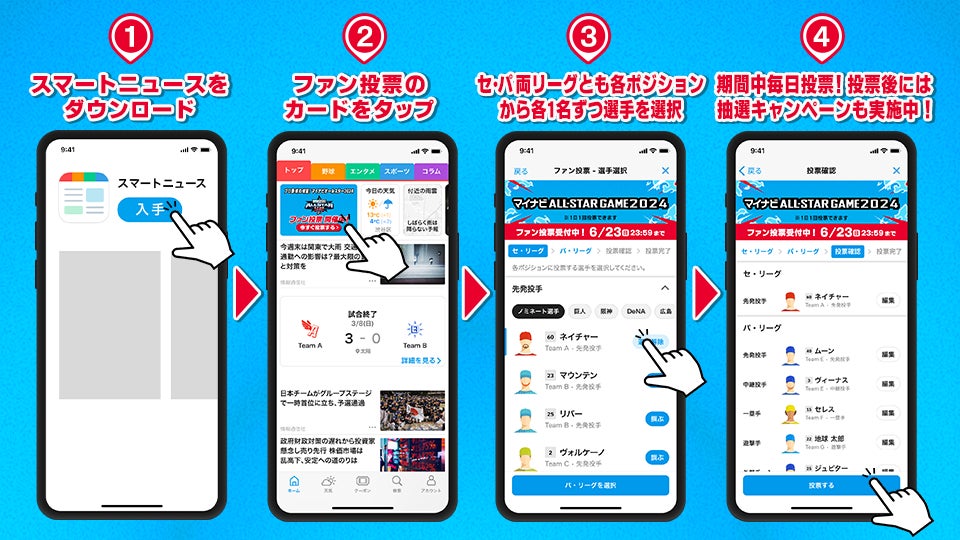 プロ野球オールスターゲームにおいて、スマートフォンアプリとして初めて、SmartNewsが出場選手を選出するファン投票を実施します。投票はSmartNews野球チャンネルで受け付けます。セ・パ両リーグとも、先発、中継、抑え投手各1名、外野手3名、他の守備位置は各1名、およびパ・リーグの指名打者1名の合計23名まで投票できます。片方のリーグ、一部のポジションおよび選手のみの投票もできます。5月18日(土)から6月23日(日)までの投票期間中、1日1回投票が可能です。