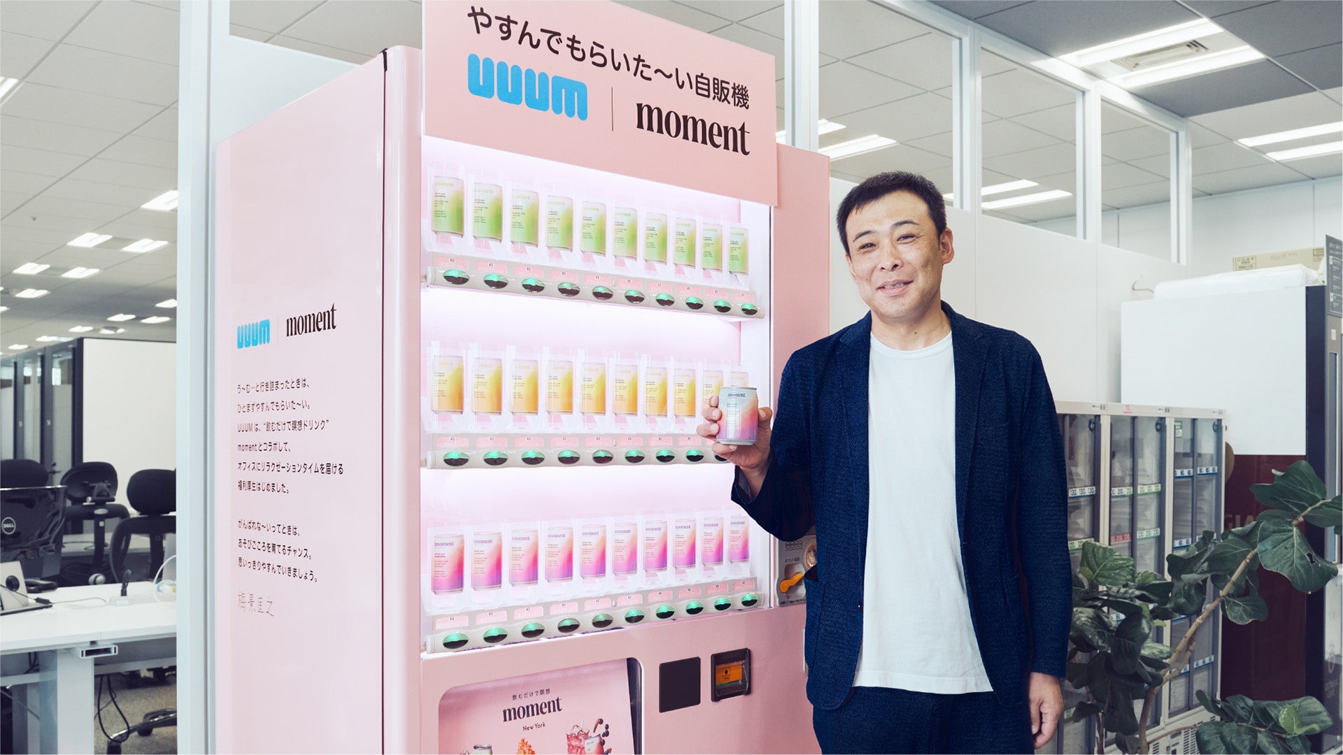 UUUM株式会社(本社:東京都港区、代表取締役 社長執行役員: 梅景 匡之、以下、UUUM)は、2024年8月20日(火)よりティグリス・ジャパン株式会社が販売するリラクゼーションドリンク「moment」とコラボレーションし、福利厚生のためのオリジナル自販機「やすんでもらいた〜い自販機」を設置しました。