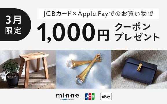 株式会社ジェーシービー (本社:東京都港区、代表取締役会長兼執行役員社長:浜川 一郎、以下:JCB)は、2022年3月1日(火)から3月31日(木)まで、ハンドメイドマーケット「minne(ミンネ) byGMOペパボ」を対象とした「JCB×Apple Payでのお買い物で1,000円クーポンプレゼント」を実施します。