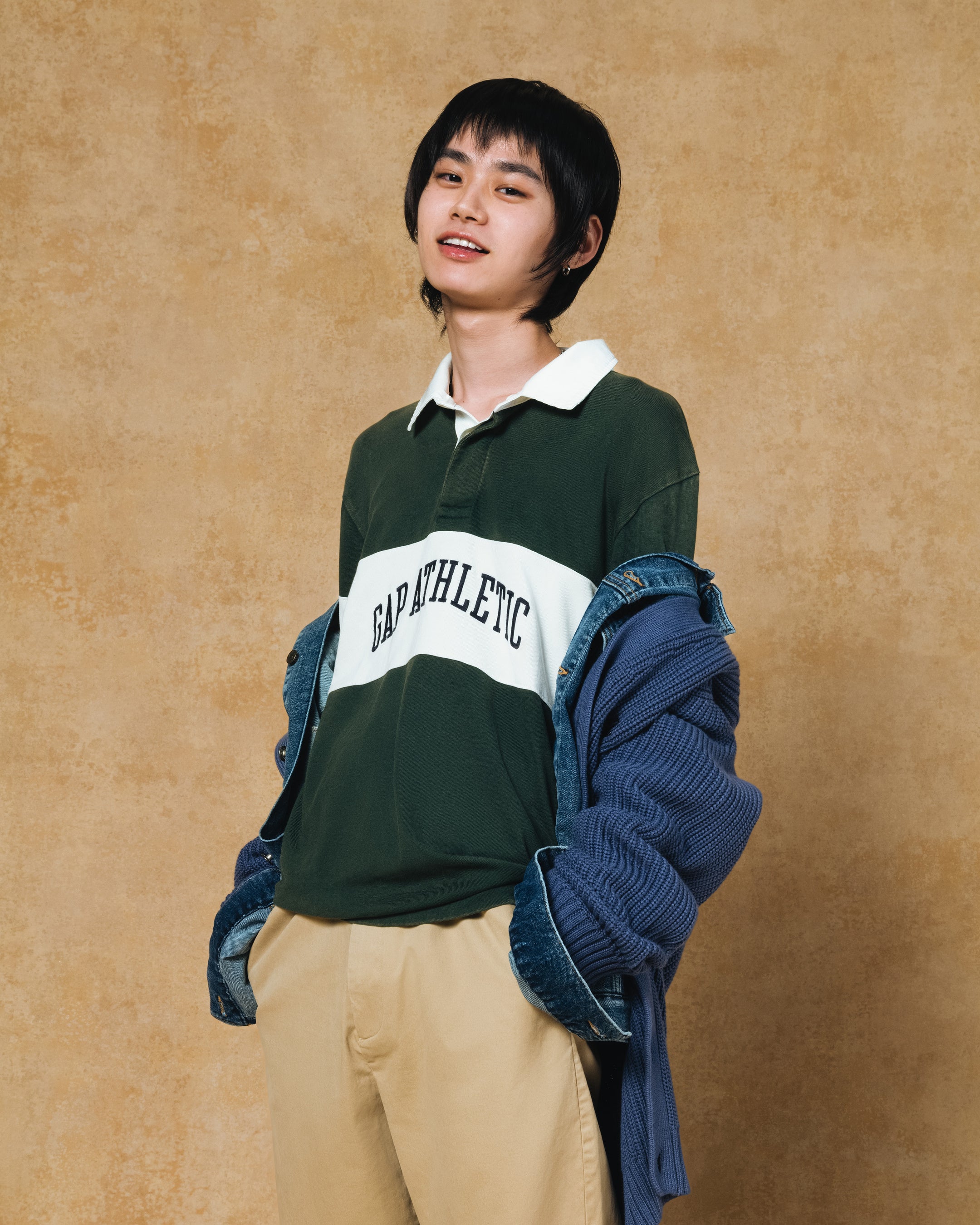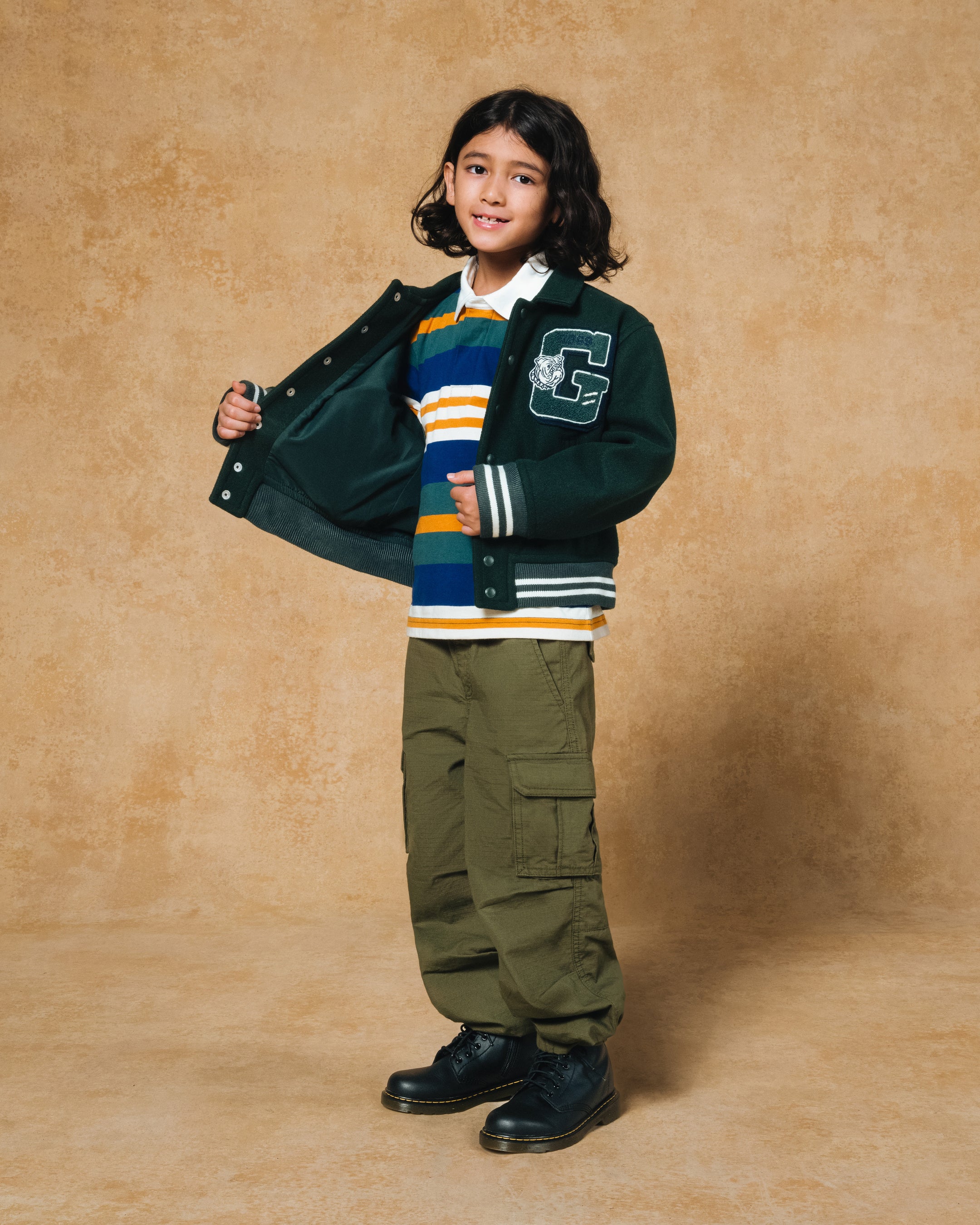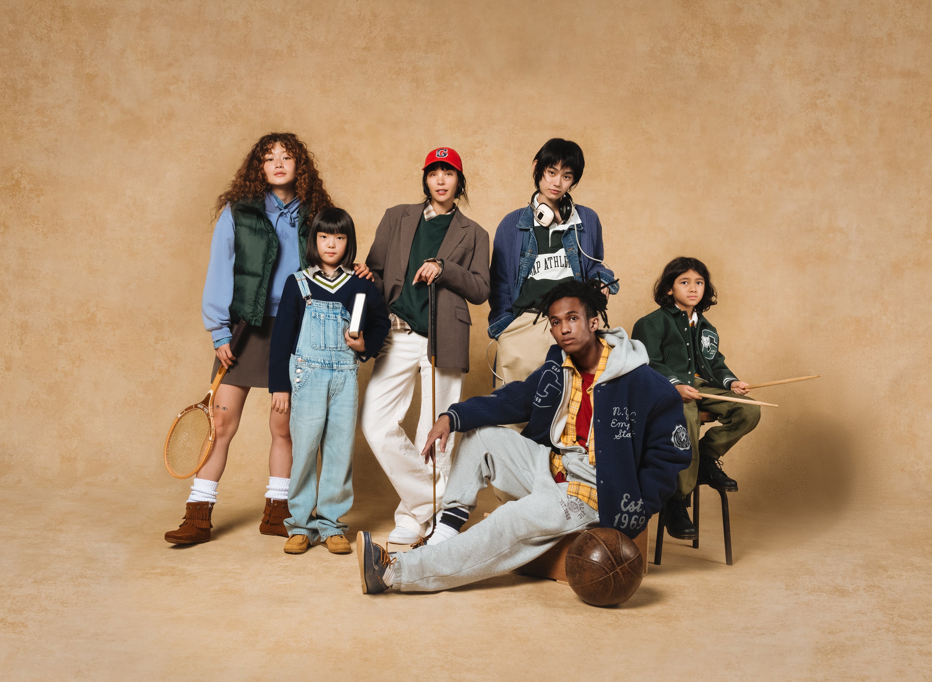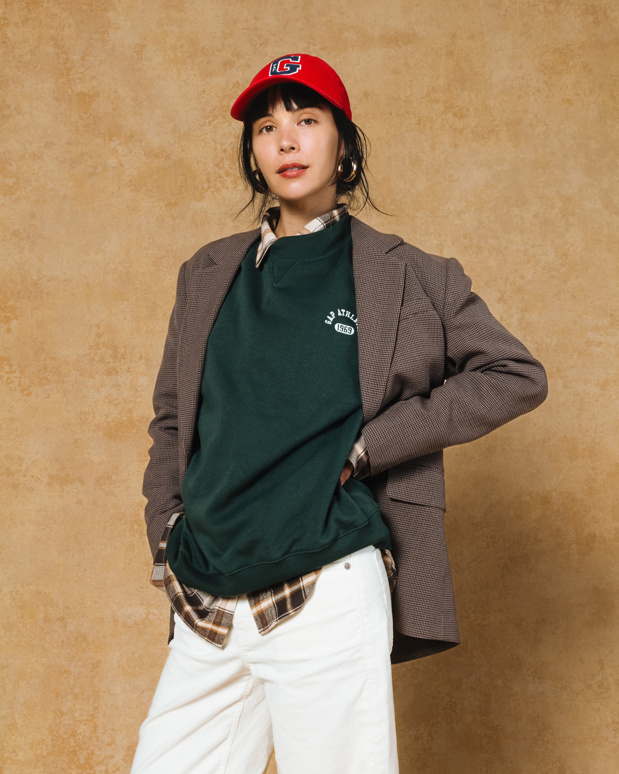 キャストが着用している注目アイテムは、今シーズンのキーカラーであるディープグリーンのロゴモックネックプルオーバー、ラガーシャツ、刺繍やワッペンがデザインされたウール混ロゴヴァーシティジャケット、ハーフジップスウェット、ポロミニドレスなどのカレッジ風アイテム。キッズは「G」ロゴが印象的なバーシティジャケット、アイビールックの定番チルデンニット、様々なカラーをミックスさせたロゴフーディーなどスクールスタイルに欠かせないアイテムです。キャストそれぞれのオリジナリティを表現し、オーセンティックとモダンが融合されたGapのヴァーシティスタイルの着こなしは必見です。